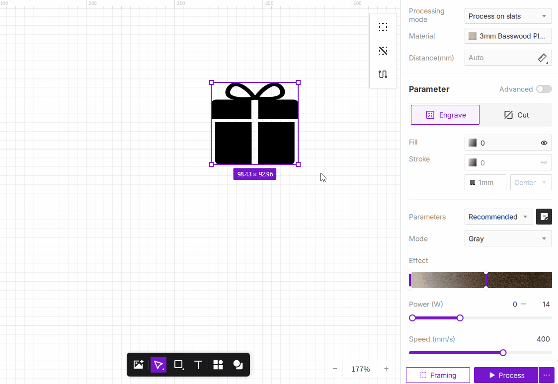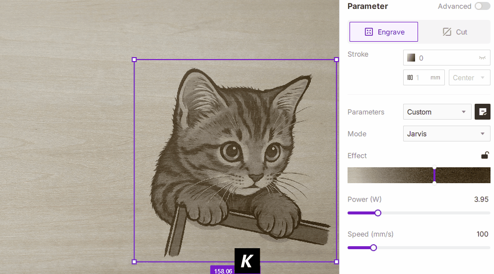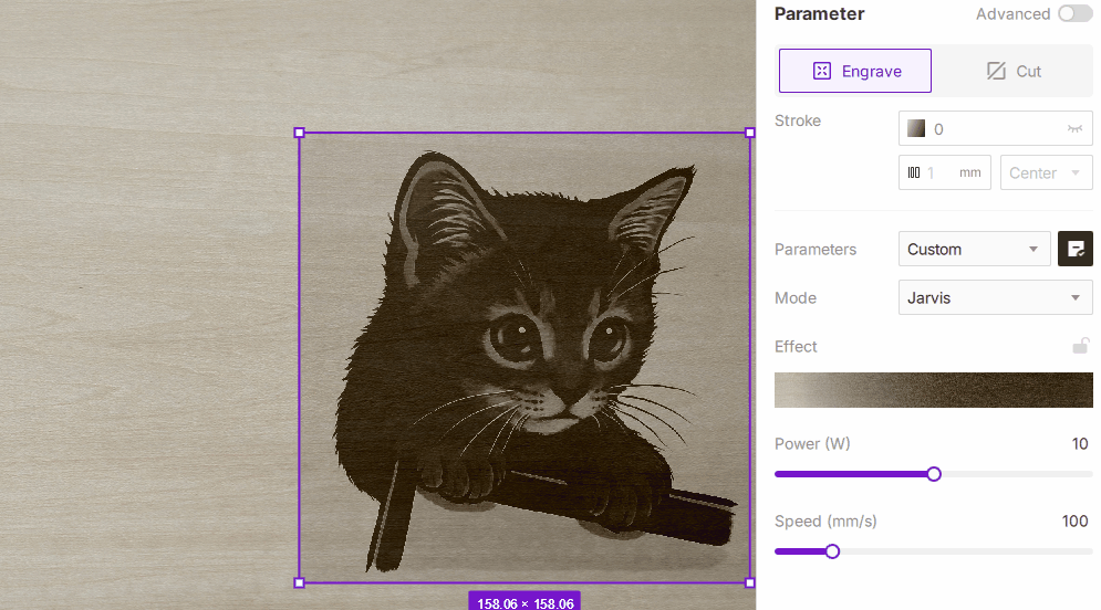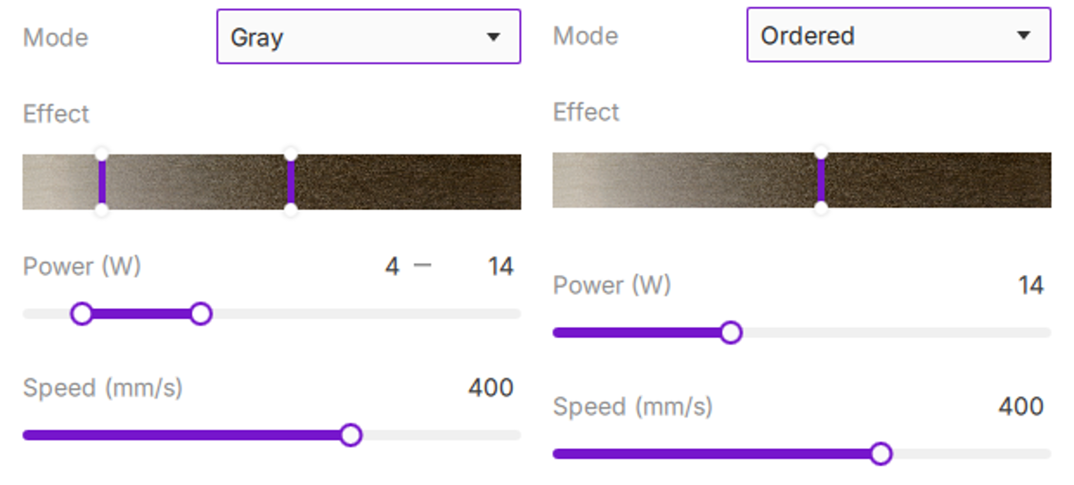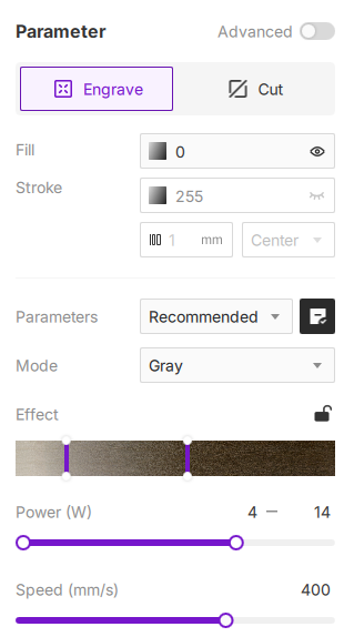 Drag the Effect slider to choose your desired engraving appearance. When you do this, the software will prioritize keeping the speed constant while adjusting the power value to match the visual effect.