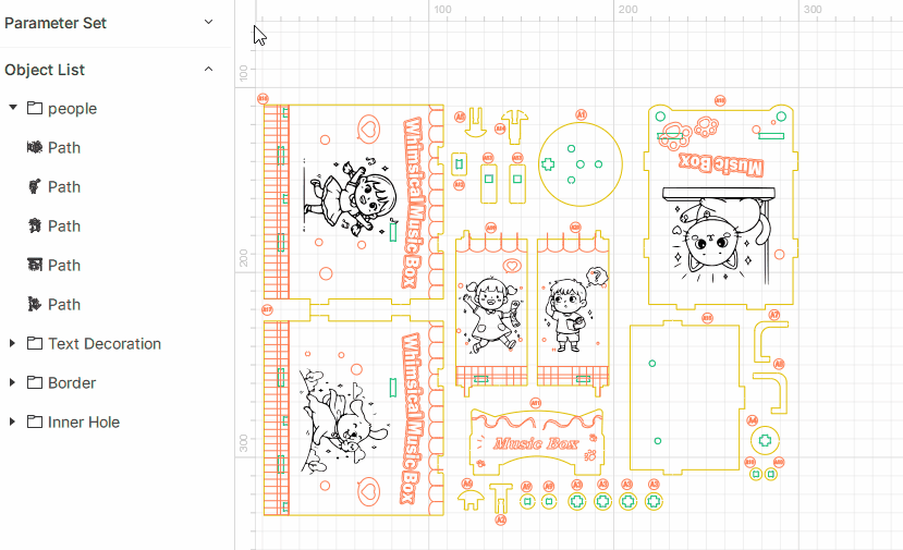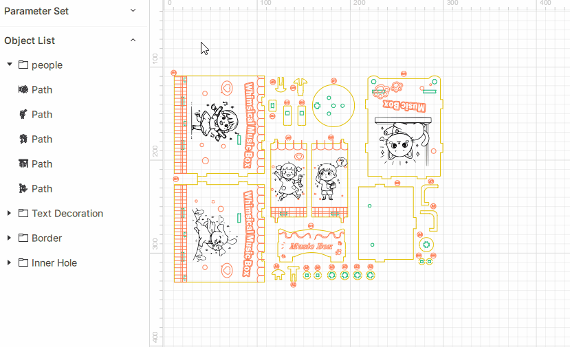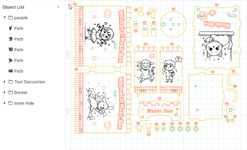 Your design may include multiple objects (primitives and groups), displayed in a hierarchical tree for easy selection, naming, grouping, and ordering.