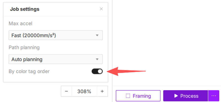 located to the right of the color label. When disabled, objects associated with this label remain visible on the canvas for design and alignment purposes; however, the machine will not process these objects or include them in the framing path. The color's hex code will appear with a strikethrough (e.g., By dragging and dropping your color tags, you can take full control of the laser processing sequence. Once you have enabled the By color tag order feature, the vertical order of your tags in the list determines the execution sequence—the topmost tag is processed first, followed by the others in descending order.