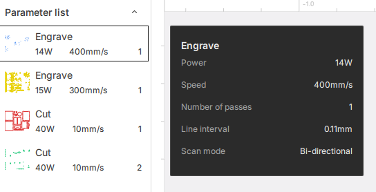 Each entry shows a thumbnail preview, the operation type (Cut or Engrave), power (W or %), speed (mm/s), and the number of passes.