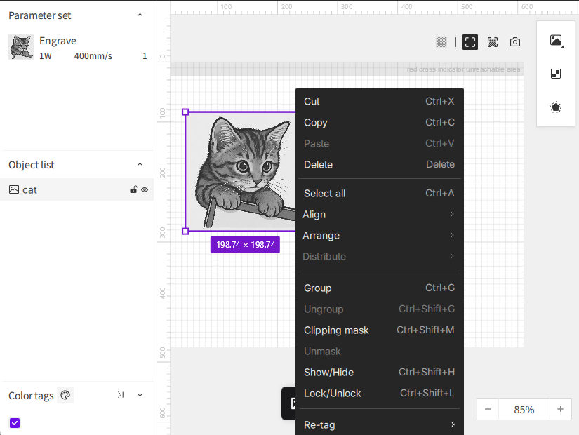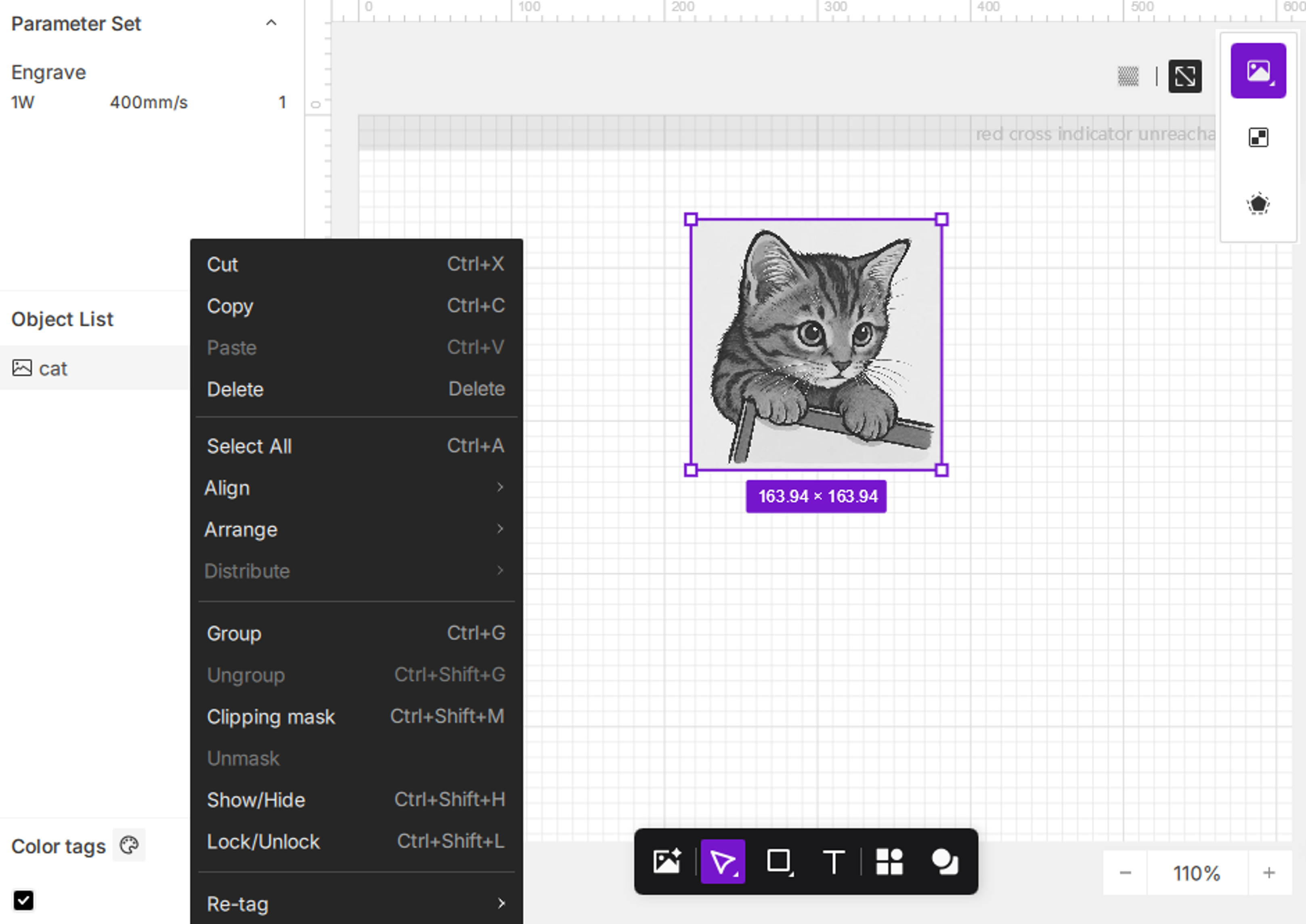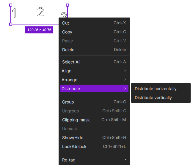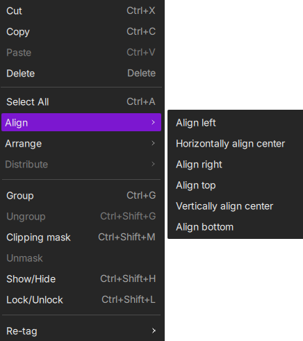 When you select one or more objects on the canvas or in the object list and right-click, the menu displays commonly used editing and arrangement tools.