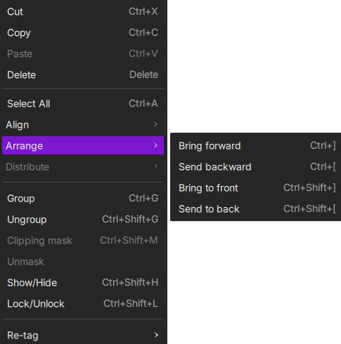 Right-clicking anywhere on the canvas opens a context menu with options tailored to your current task. There are three types of right-click menus: right-clicking on an object, on the canvas, or in the object list.