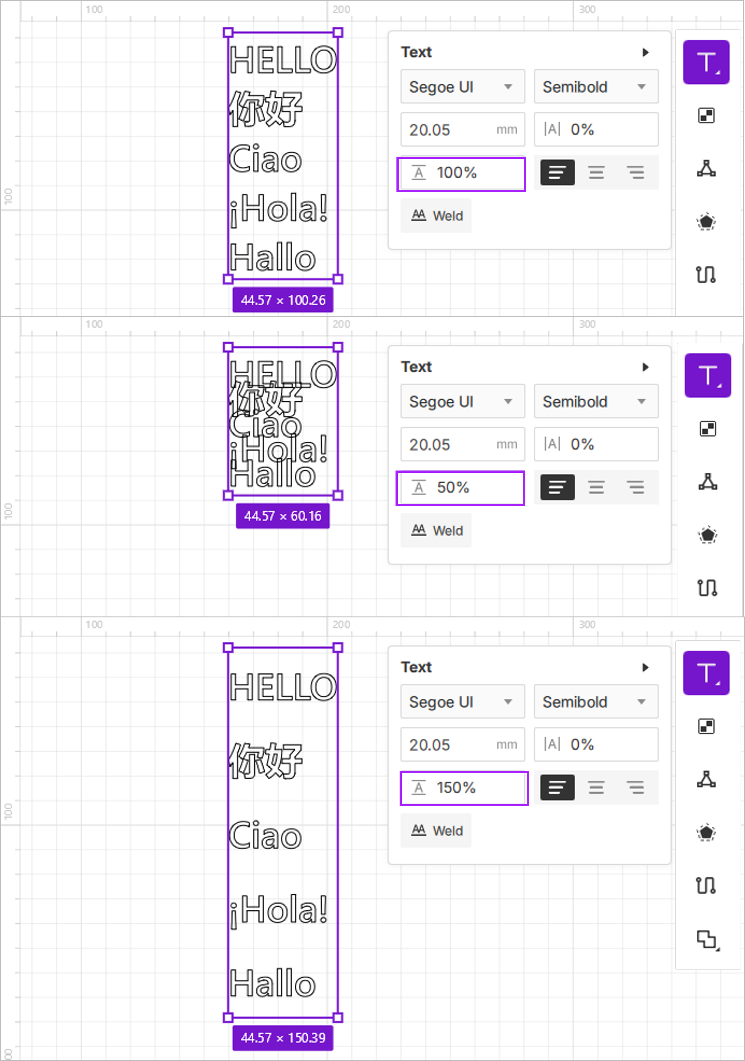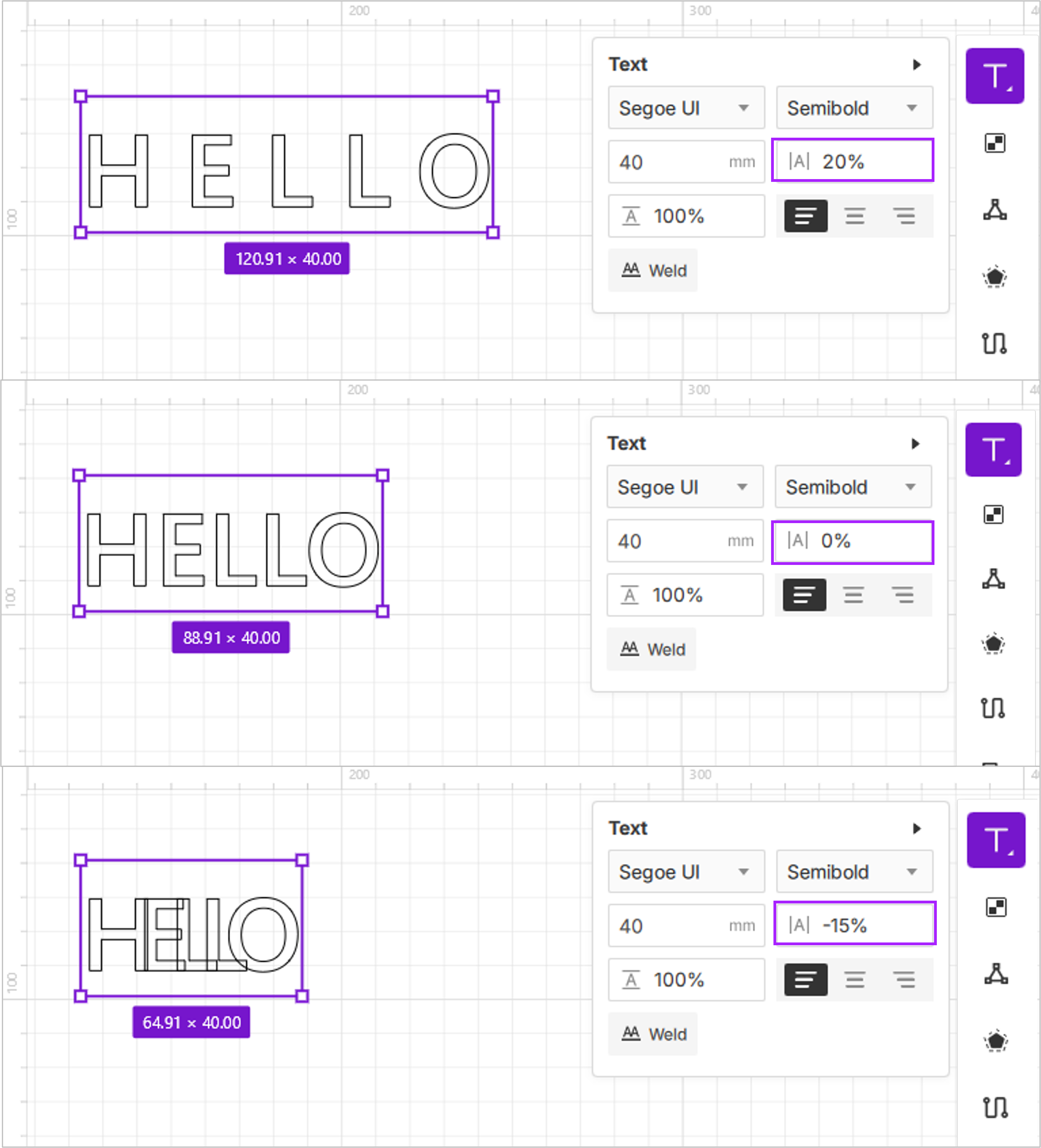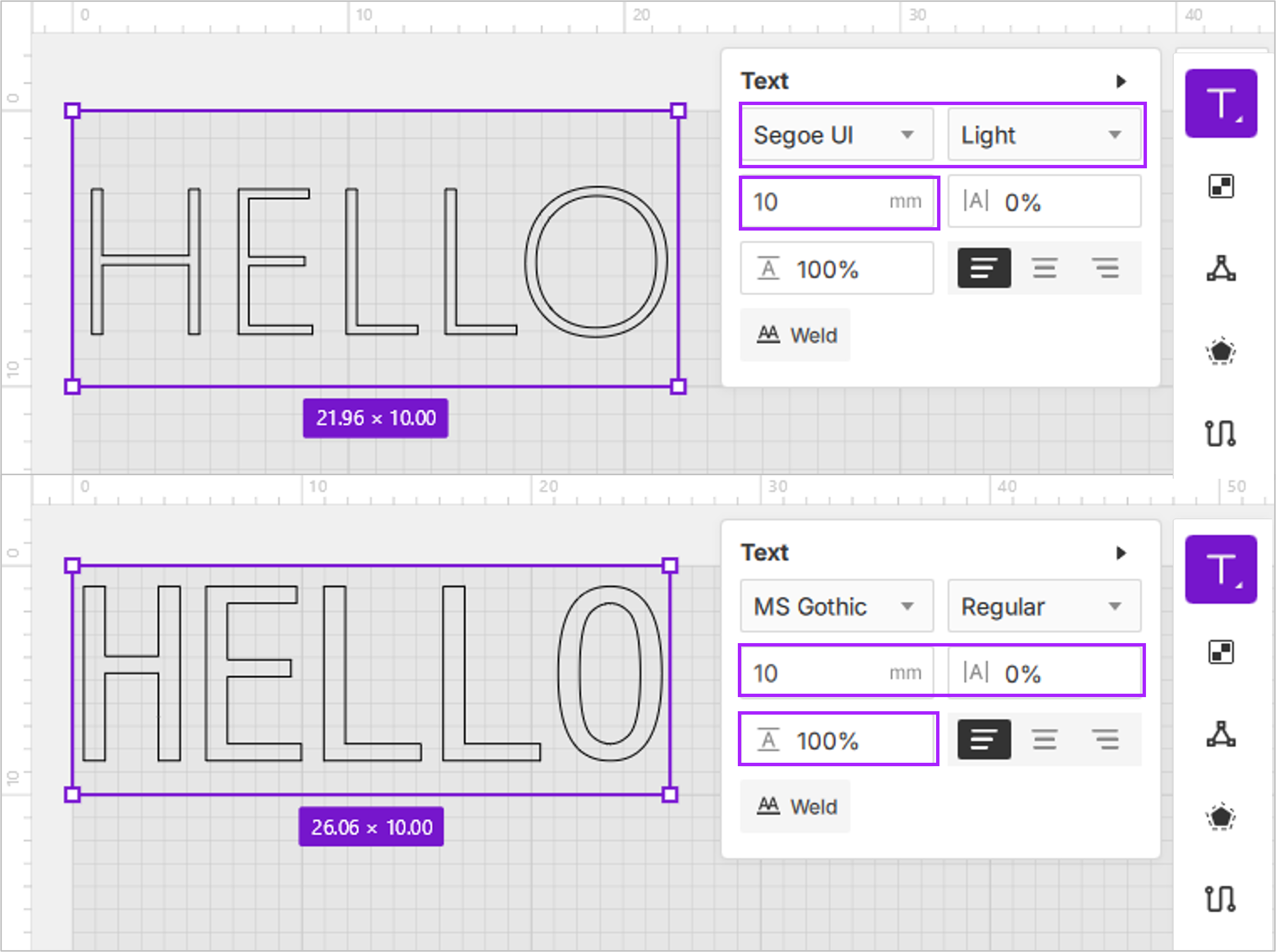Text properties allow you to adjust the appearance and layout of text objects, including the font, weight, height, letter spacing, line spacing, alignment, and weld options. These settings help you control how your text looks and how it fits within your design, giving you the flexibility to create the exact style you want.