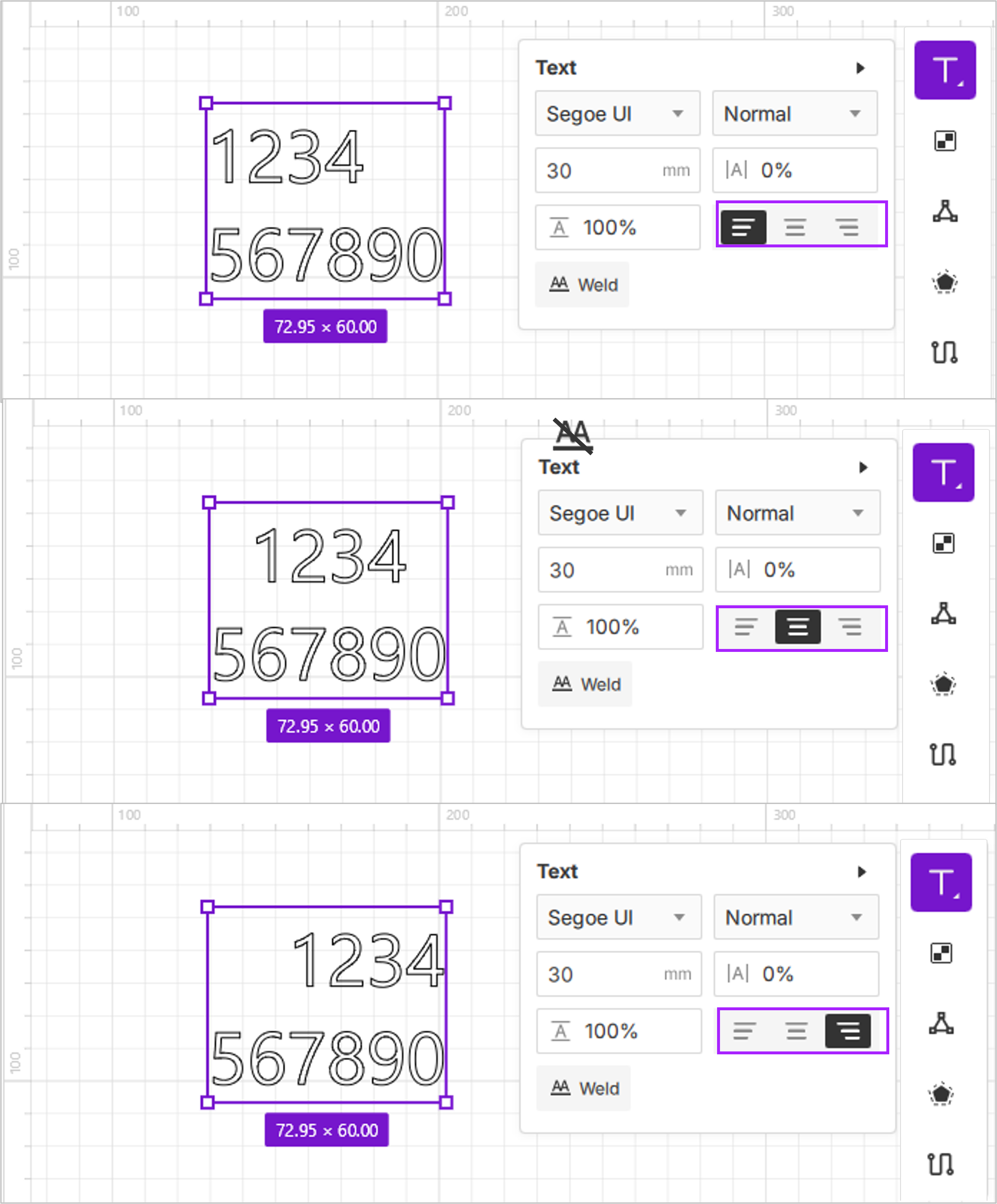 Text Weld merges the paths of overlapping characters into a single continuous outline. This removes duplicated engraving or cutting paths, allowing the laser to move more smoothly and produce cleaner results.