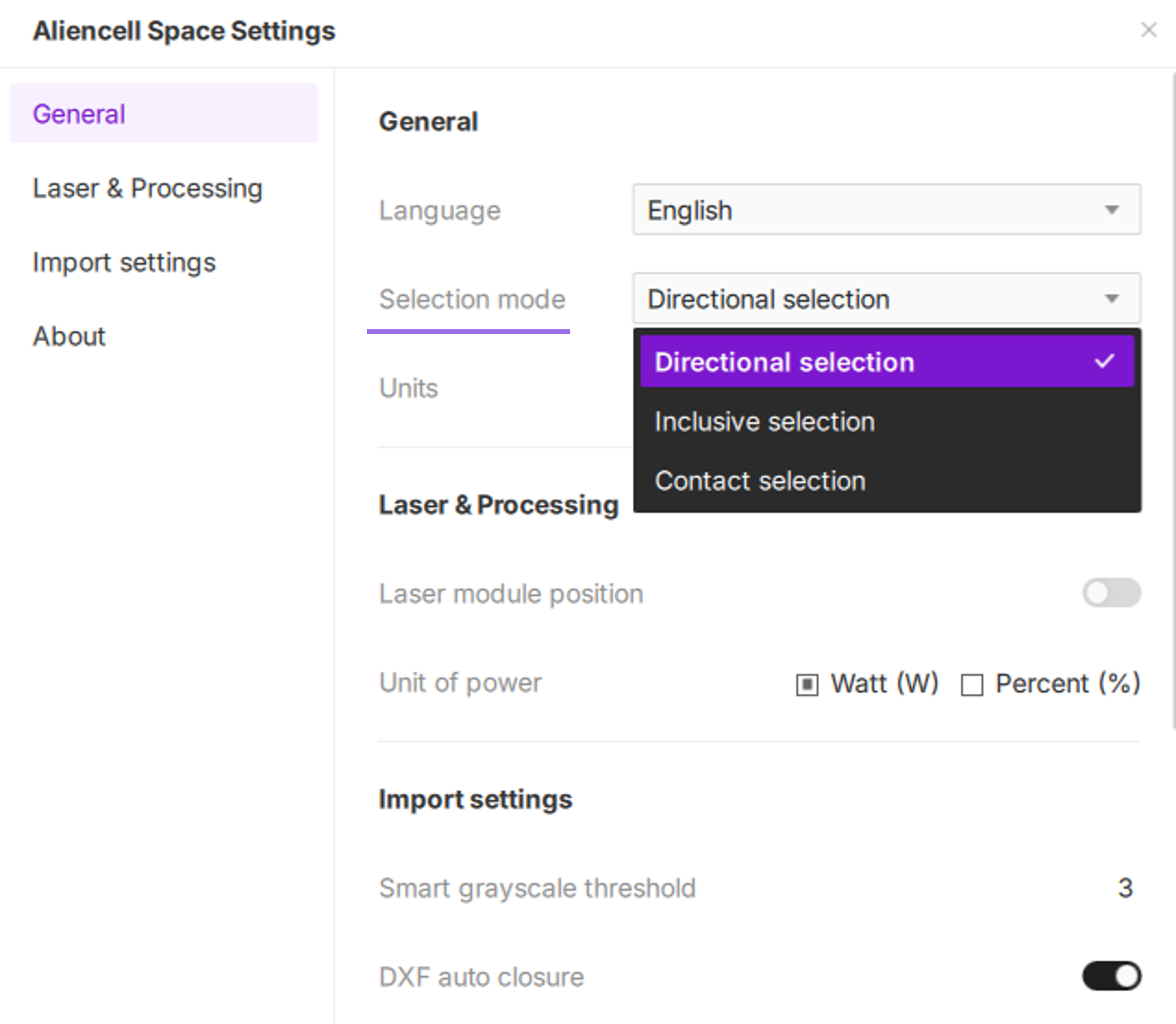 The Settings panel allows you to customize the fundamental interface preferences, configure laser behavior, and manage file import rules for Aliencell Space.