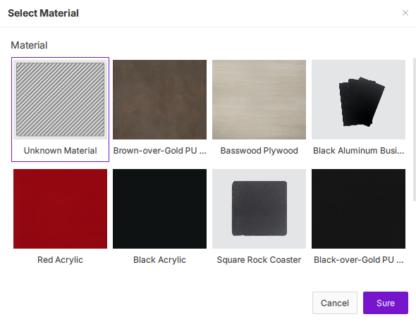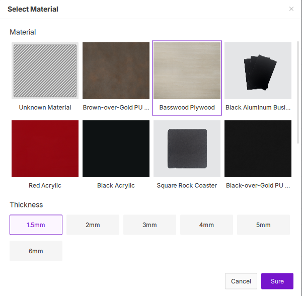 Material settings allow you to choose the material type and its thickness for your current job. Since different materials (such as wood, acrylic, or metal) react very differently to laser energy, selecting the correct material type enables the software to automatically configure a reliable set of initial processing parameters.