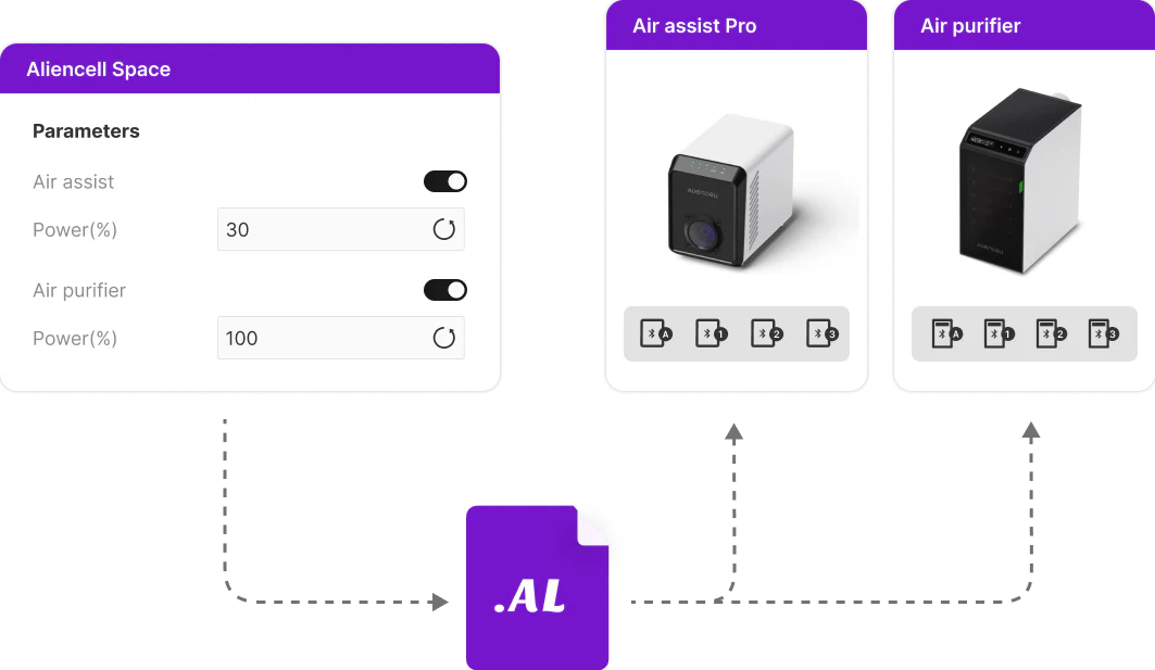 Adjust external accessories such as airflow, fan power, and operating modes directly through the software. The system automatically matches presets for different job types (e.g., stronger exhaust for cutting, lower levels for engraving) to create a seamless, integrated workflow.