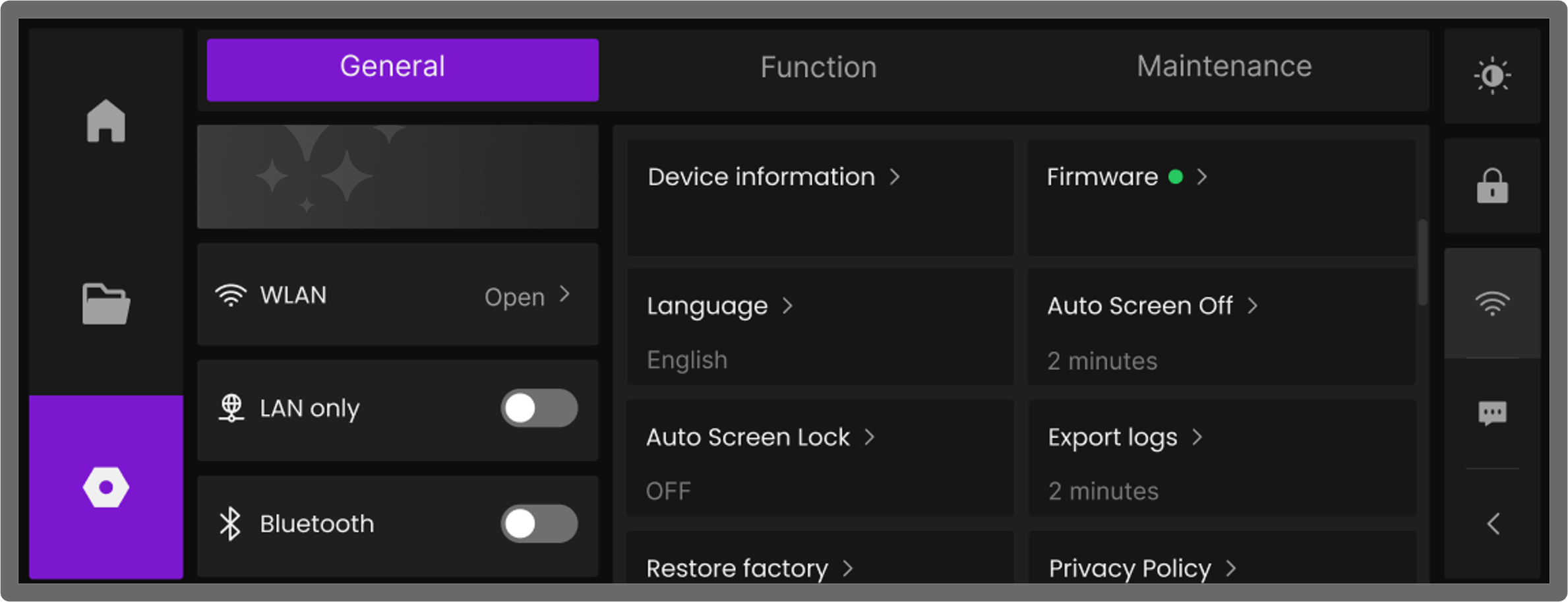 HomeFilesSettingsFirst-Time UseGeneral SettingsFunction SettingsMaintenance Settings