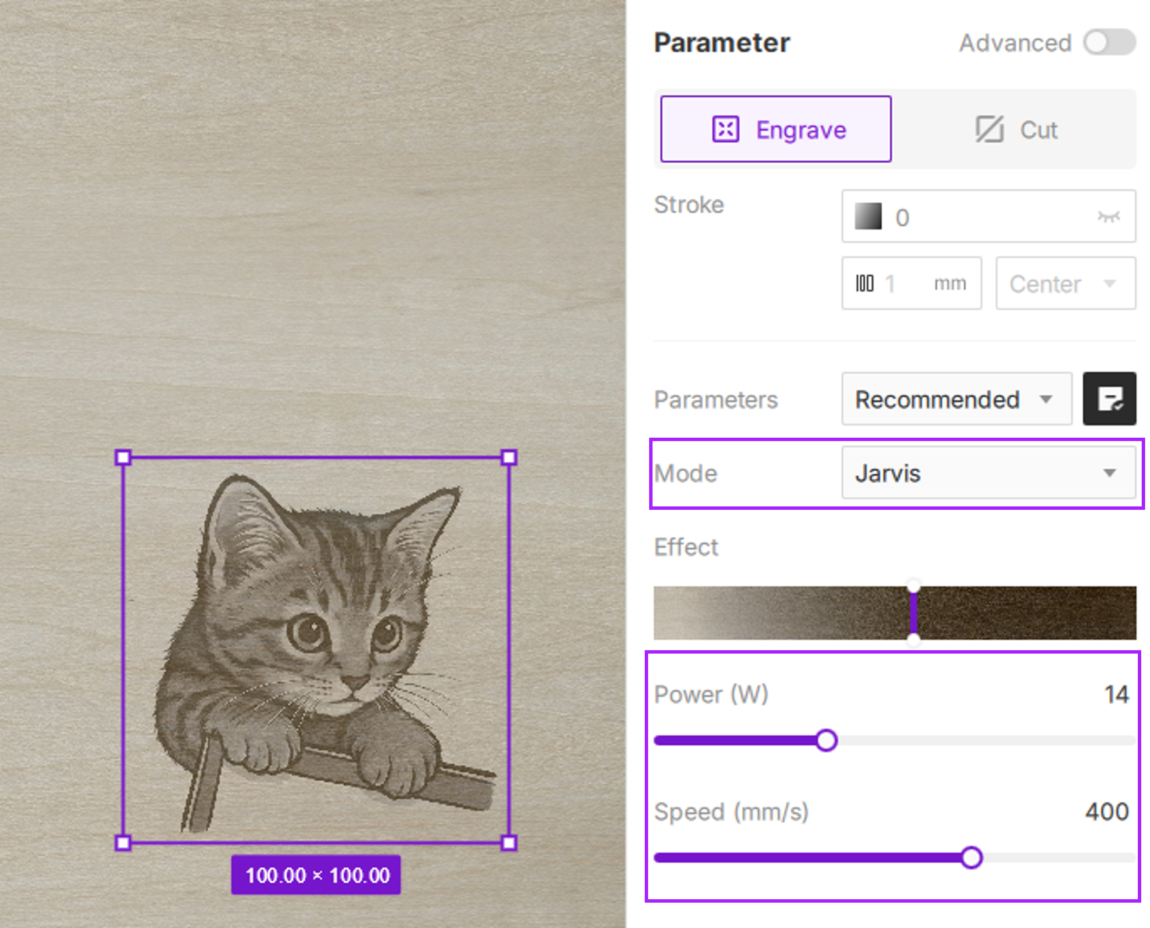 Effect Adjustment: With Material Simulation enabled, use the Effect slider to fine-tune the engraving depth and appearance.
