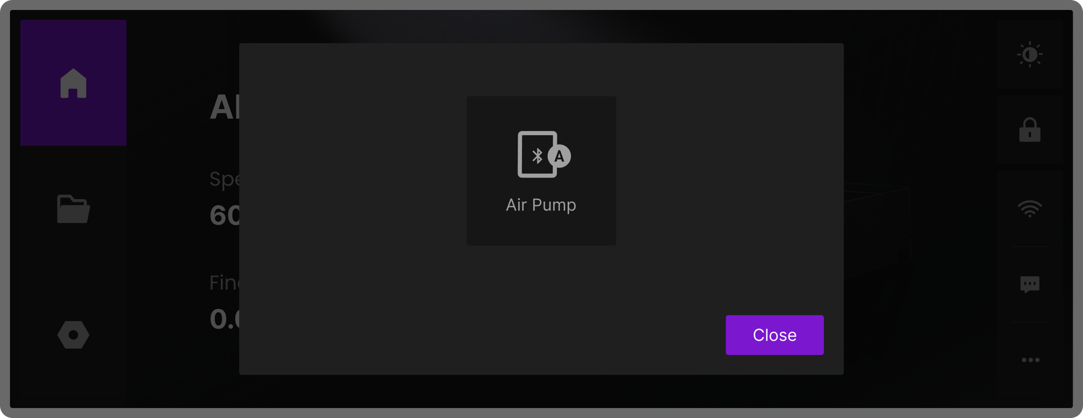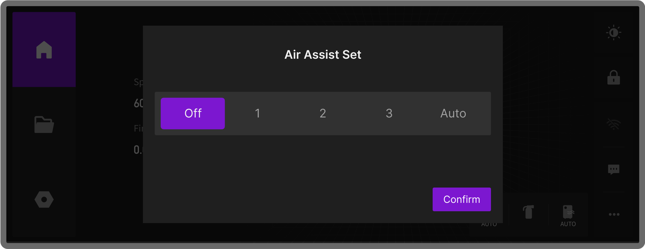 When the device is connected to an air pump, tapping the Air Pump icon will open the air pump settings window. Tap Air Assist Set to enter the air pump mode adjustment page, where you can select the following modes: