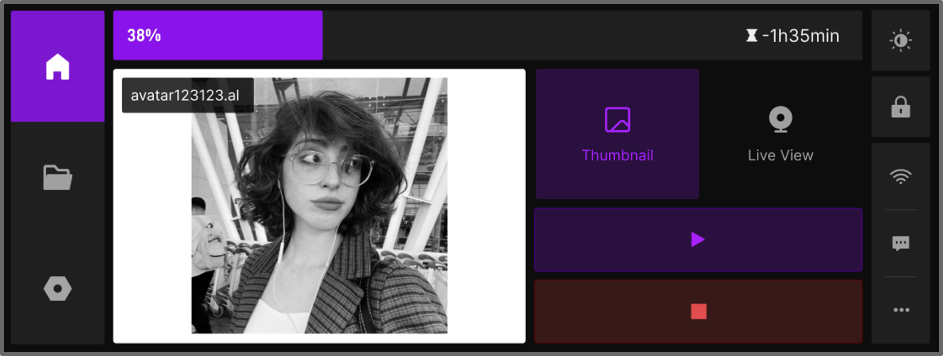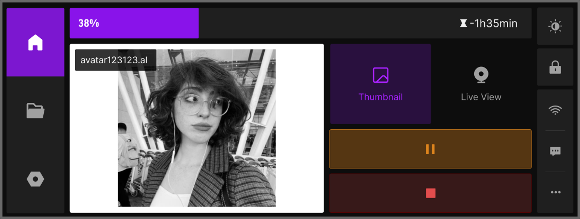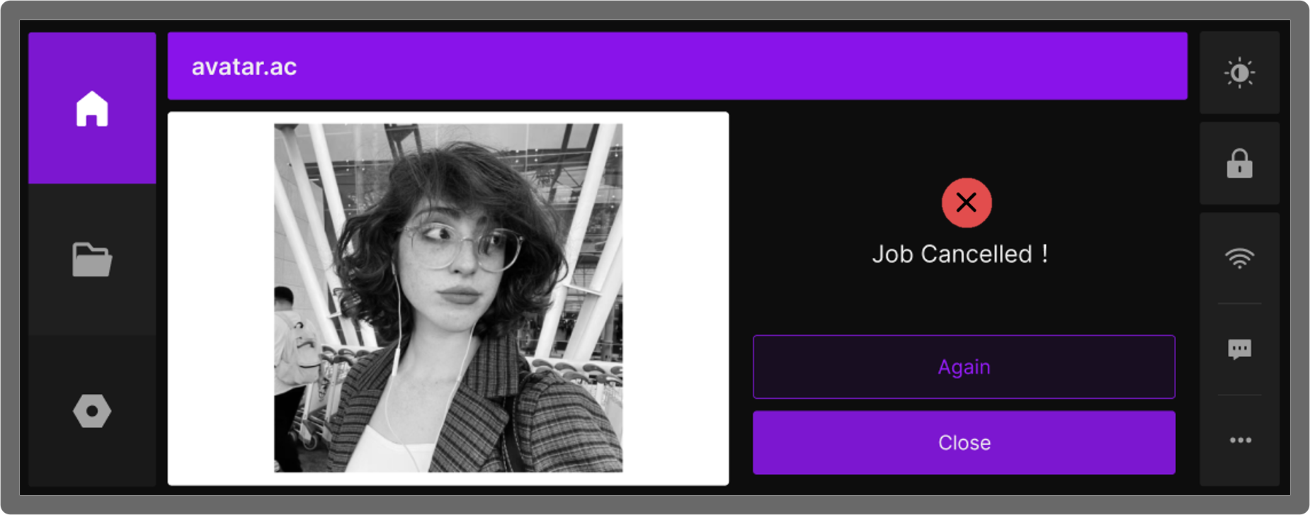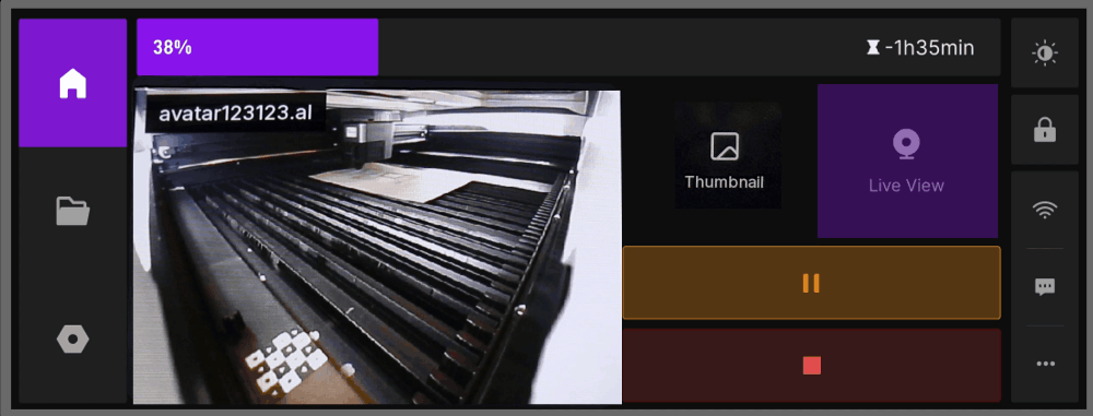 The Job page lets you monitor and manage ongoing tasks. In Job Mode, you can view the canvas Thumbnail and watch the real-time feed through Live View on the Aliencell X1 touchscreen.