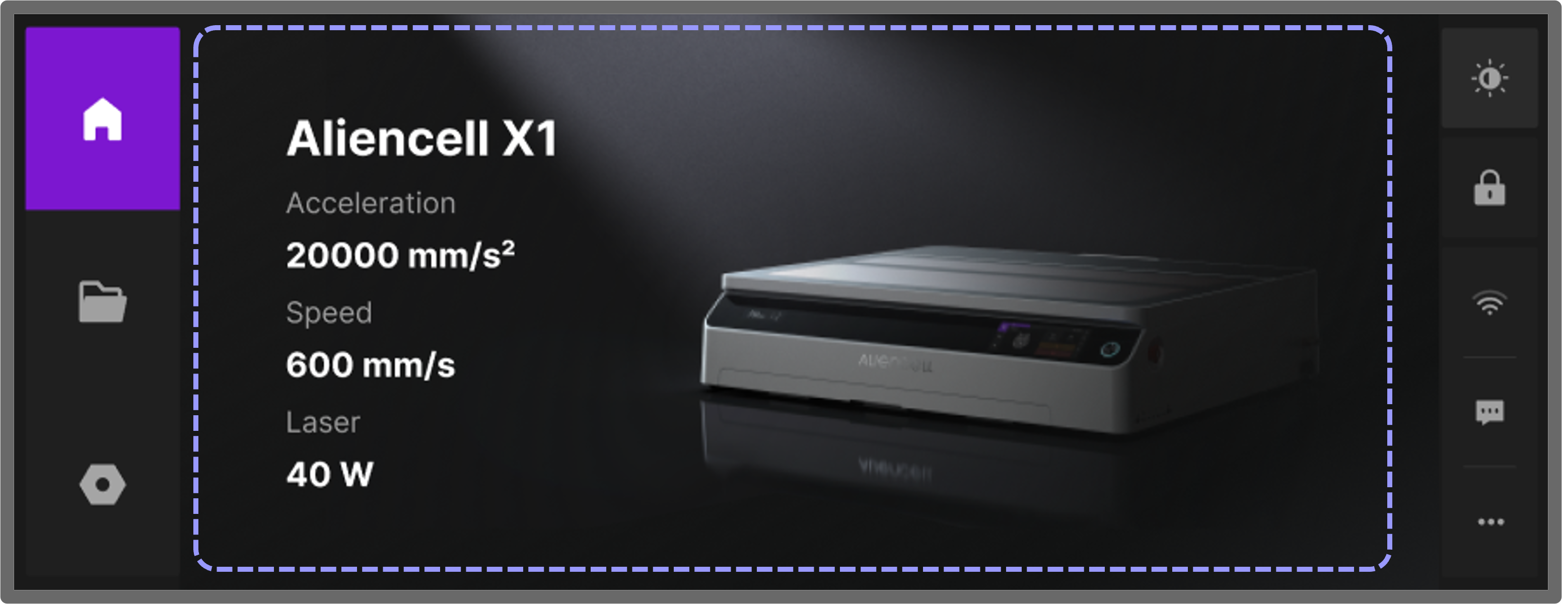 Acceleration: Maximum acceleration of the device’s motion system.Speed: Maximum operating speed of the motion system.Power: Maximum rated power of the laser.This page is the default homepage, allowing users to quickly verify the device identity and check key parameters. Once a processing job begins, the Device Status page switches from Standby to Job Mode.