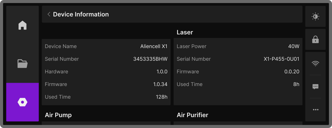 The Device Information page provides detailed specifications and operational data for the Aliencell X1 and its connected modules. You can access this page via the touchscreen interface.