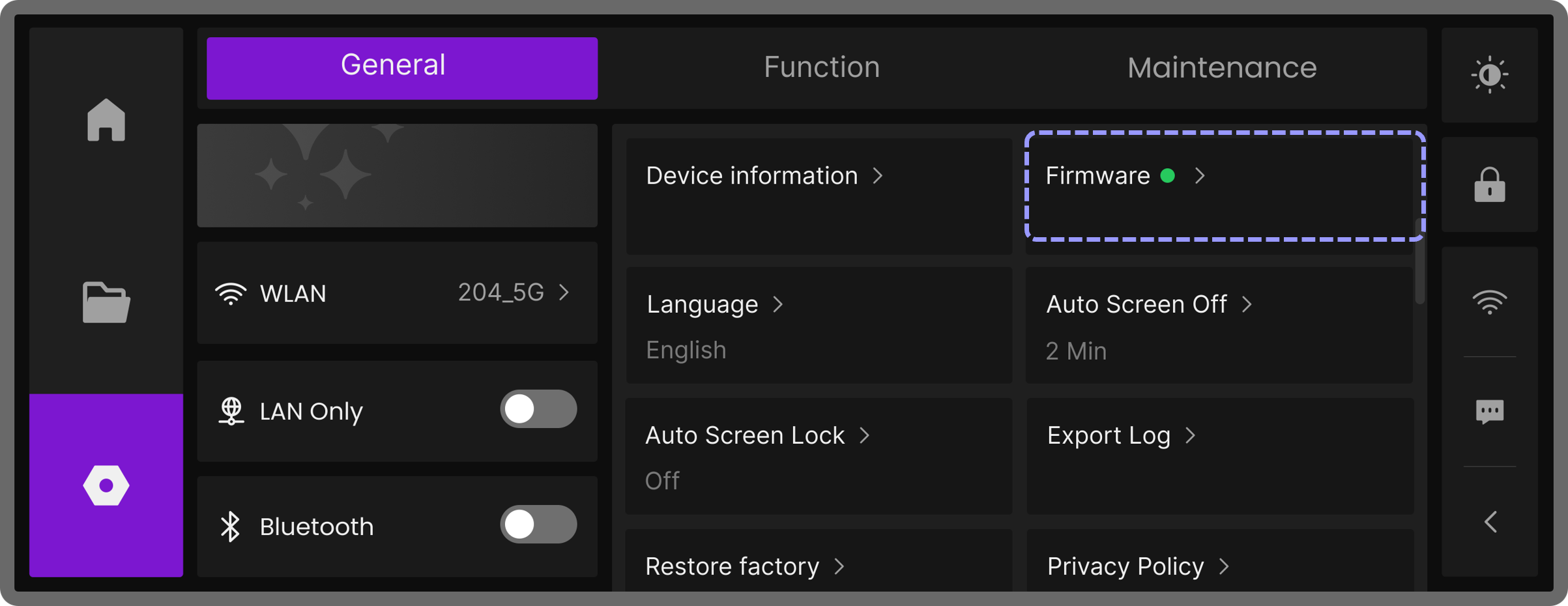 icon and select Firmware under General. On the firmware page, you can check the current firmware version, perform updates, or view additional version details.