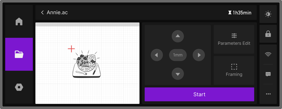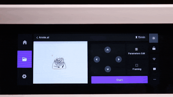 Tap Framing on the screen. The Laser Module will move along the edges of the processing file in the work area, helping the user verify that the design fits within the material size.