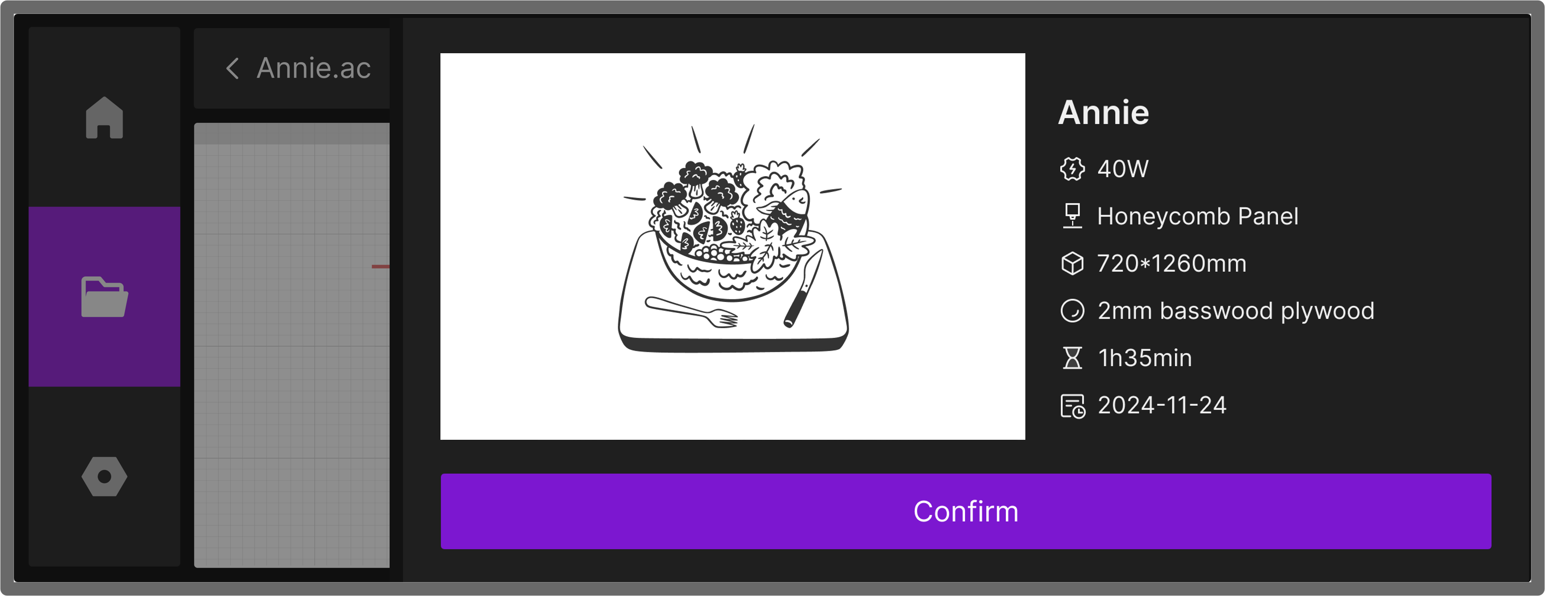 After selecting a processing file, the design parameters for the file will appear, including the laser power used to generate the slicing file, file size, material specifications, expected processing time, and the date the slicing file was created.