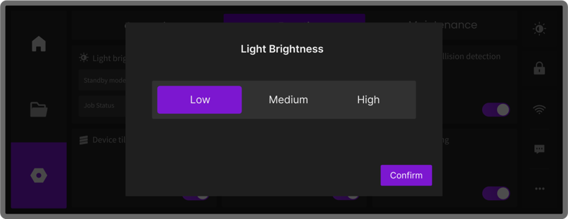 In the device settings under Function, find and tap Light Brightness. A window will pop up allowing you to adjust the LED illumination brightness level, showing three options: Low, Medium, and High, each corresponding to a different light intensity.