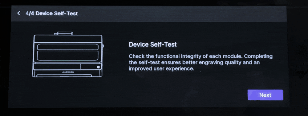 The device will perform a self-test on its core modules to ensure everything is working correctly. Running the self-test helps guarantee better engraving quality and a more stable user experience.
