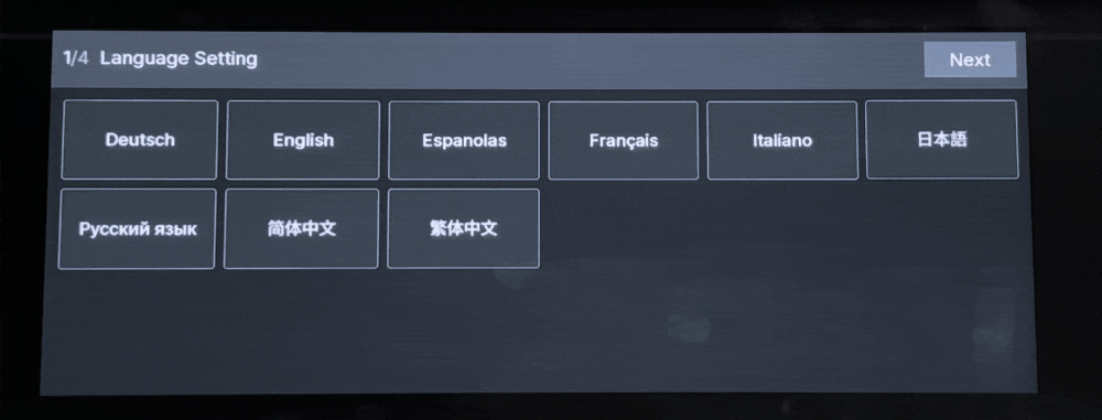 The Aliencell X1 touchscreen supports 8 languages. On startup, select the desired interface language and tap Next.