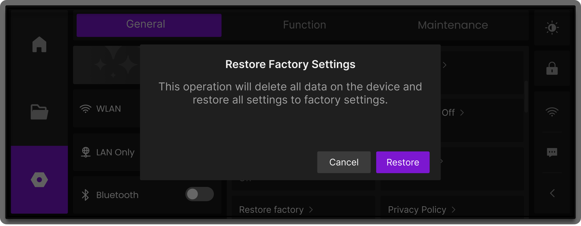 The touchscreen provides a Restore Factory Settings function. When the device needs to be redeployed, transferred, or when it encounters abnormal conditions, this operation can reset the device to its original factory state to ensure system stability.